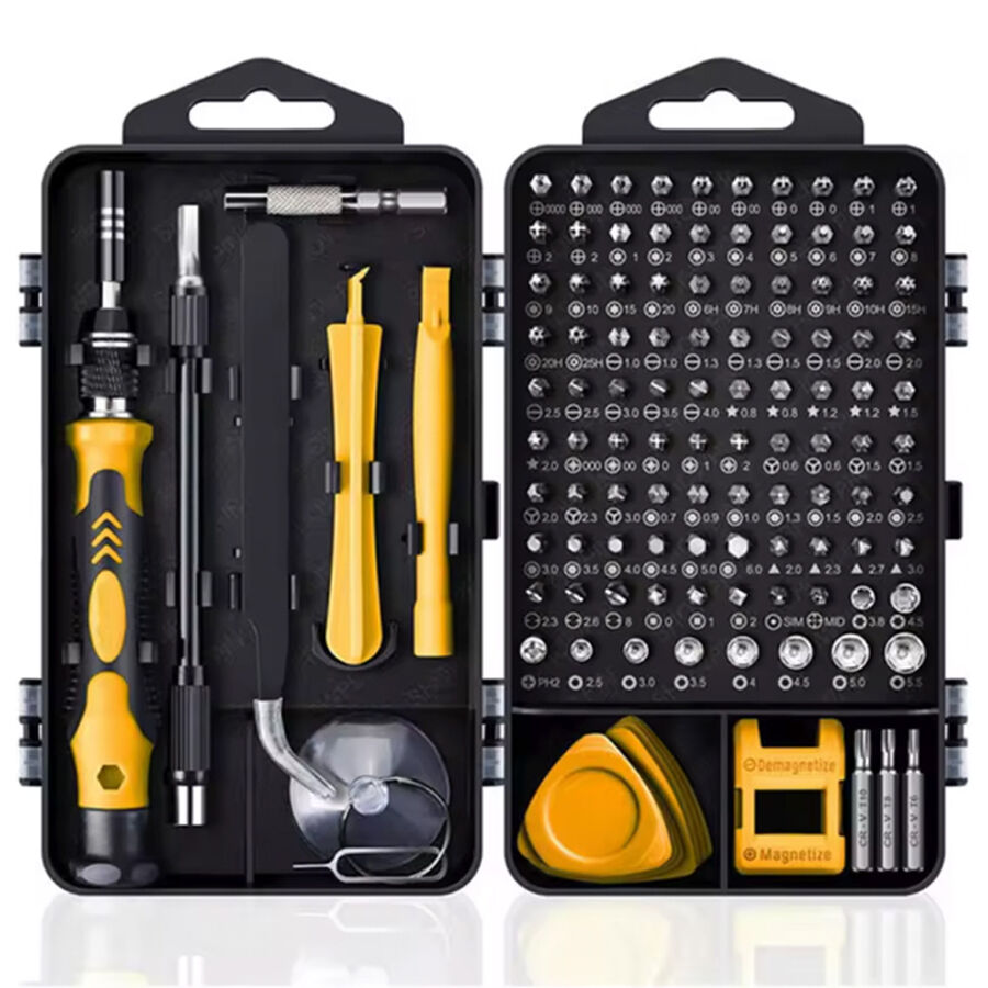 115’i 1 arada Komple Tamir Takımı, günlük hayatta ve profesyonel kullanımlarda ihtiyaç duyabileceğiniz tüm tornavida ve aksesuarları tek bir kutuda sunar. Cep telefonu, bilgisayar, tablet, kamera, oyun konsolu, gözlük, saat ve model yapımı gibi pek çok alanda vidalama ve onarım işlemlerini kolayca gerçekleştirmenizi sağlar. Geniş uç çeşitliliği sayesinde farklı tip ve boyutlardaki vidalarla uyumlu çalışır, böylece tek bir set ile çok sayıda işinizi pratik biçimde çözebilirsiniz.