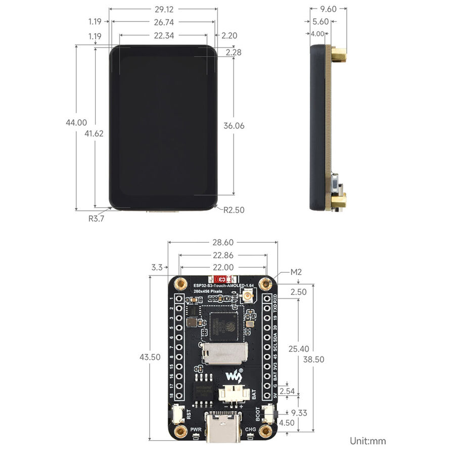 Kart üzerinde bulunan 1.64 inç AMOLED ekran, QSPI arayüzü ile çalışır ve 280×456 çözünürlükte 16.7 milyon renk desteği sunar. Kapasitif dokunmatik özelliğe sahip olan bu ekran, I2C arayüzü üzerinden kontrol edilerek kullanıcı etkileşimini kolaylaştırır. Bu sayede LVGL gibi gelişmiş grafik arayüz kütüphaneleri sorunsuz bir şekilde çalıştırılabilir. Ayrıca board'un sahip olduğu zengin çevresel kaynaklar, HMI (Human-Machine Interface) ve benzeri görsel arayüz gerektiren uygulamaların hızlı bir şekilde geliştirilmesine imkan tanır.