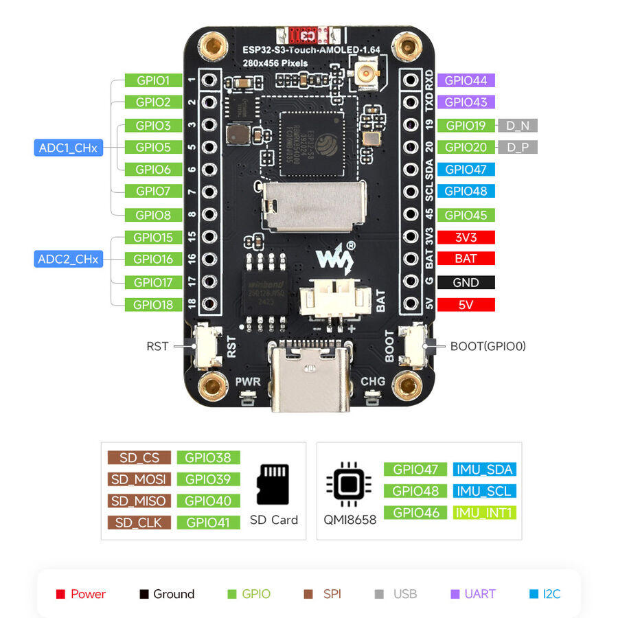 Yerleşik QMI8658 6 eksenli IMU sensörü, 3 eksenli ivmeölçer ve 3 eksenli jiroskop ile hareket algılama, jest tanıma ve adım sayma gibi fonksiyonları destekler. Bunun yanında TF kart yuvası sayesinde görüntü, veri veya diğer dosyalar harici olarak depolanabilir. 3.7V MX1.25 lityum pil girişi ile taşınabilir projeler için ideal bir güç çözümü sunarken, Type-C bağlantı noktası üzerinden hem güç beslemesi hem de yazılım yükleme ve hata ayıklama yapılabilir.
