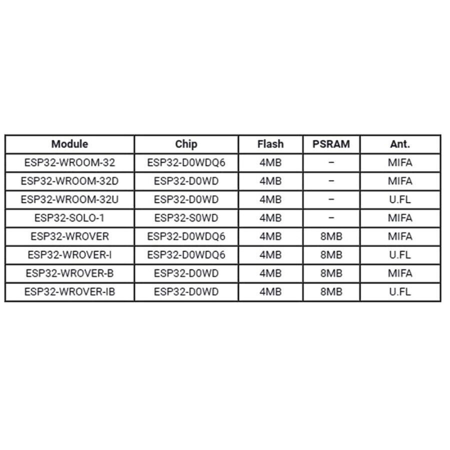 Manufacturer Espressif Product Category Wifi Module Sherry ESP32-WROOM-32U Chip ESPG2-DOWD SPI Flash 32 Mbit, 3.3V Crystal 40Mhz Antenna The U.FL carrier must be equipped with an IPEX antenna WiFi Frequency 2.4GHZ ~ 2.5GHZ Interface SD card, UART. SPI. SDIO. I2C.LED PWM, motor PWM. I2C, IR, pulse counter, GPIO, capacitive touch sensor, ADC.DAC On-Chip Crystal 40MHZ crystal Integrated SPI Flash 4 MB Working Voltage / Supply Voltage 2.7V ~ 3.6V Average Operating Current 80mA Minimum Supply Flow 500mA Documents